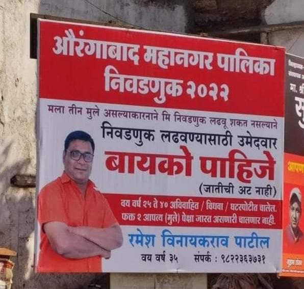 शहरातील गुलमंडी, औरंगपुरा यासह इतरही काही भागात हे बॅनर लागल्याचे शहरवासीयांच्या नजरेस पडले. तेव्हापासून या बॅनरचे फोटो सोशल मीडीयावर व्हायरल झाले आहेत. या बॅनरवर एका व्यक्तीचा फोटो असून त्याखाली रमेश पाटील असे नाव आहे. मनपा निवडणूक २०२२, मला तीन मुले असल्याने मी निवडणूक लढवू शकत नाही, निवडणूक लढविण्यासाठी उमेदवार बायको पाहिजे, असा मजकूर आहे. जातीची अट नाही असा उल्लेखही त्याखाली आहे. त्याने केलेल्या या बॅनरची परिसरात व सोशल मीडियावर चर्चा सूरू आहे.