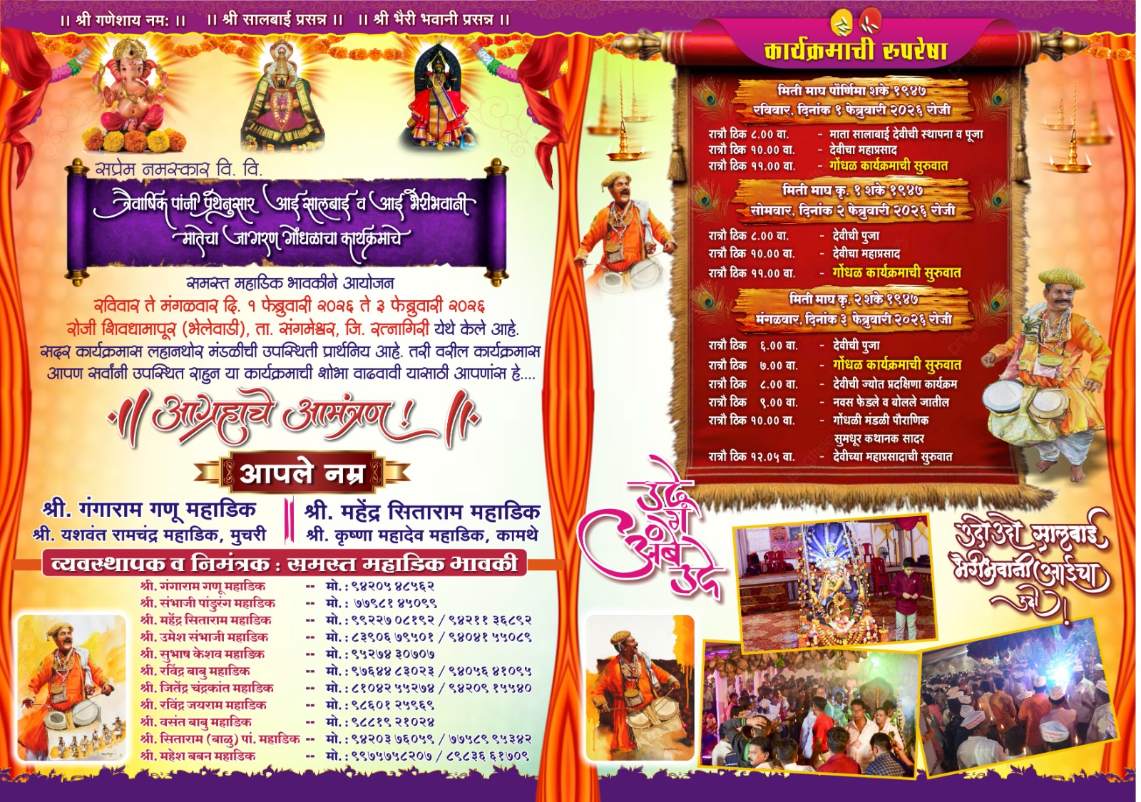 एक फेब्रुवारीपासून हा जागरण गोंधळ उत्सव सुरू आहे. आज जागरण गोंधळाचा शेवटचा दिवस असल्याने आजच्या दिवशी नवस फेडले आणि बोलले जातील त्यानंतर जागरण गोंधळाचा कार्यक्रम होऊन महाप्रसादाचा कार्यक्रम होईल. असे व्यवस्थापकीय मंडळाकडून सांगण्यात आले.